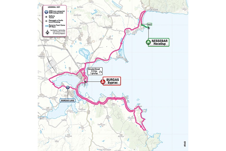ネセバルをスタート。ブルガスの街を通過してブルガス湖を周回、海岸線に沿って進んだのち、再びフィニッシュ地点へと戻ります