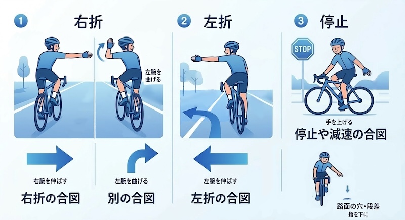 利き腕をロードバイクから離したくない場合は別の合図もあります。